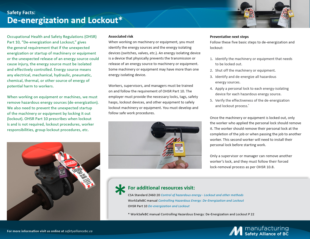 When working on equipment or machines, we must remove hazardous energy sources (de-energization). We also need to prevent the unexpected startup of the machinery or equipment by locking it out (lockout). In this Toolbox Talk, discuss the electrical hazards and what controls you have in place related to working with machinery and equipment.