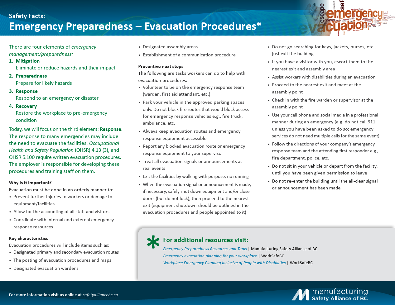 If and when an emergency occurs, do you have an evacuation plan in place? The Occupational Health and Safety Regulation (OHSR) 4.13 (3), and OHSR 5.100 require written evacuation procedures; and the employer is responsible for developing these procedures and training staff on them. Use this Toolbox Talk to review your evacuation procedures and understand how this will fit into your emergency preparedness plan.