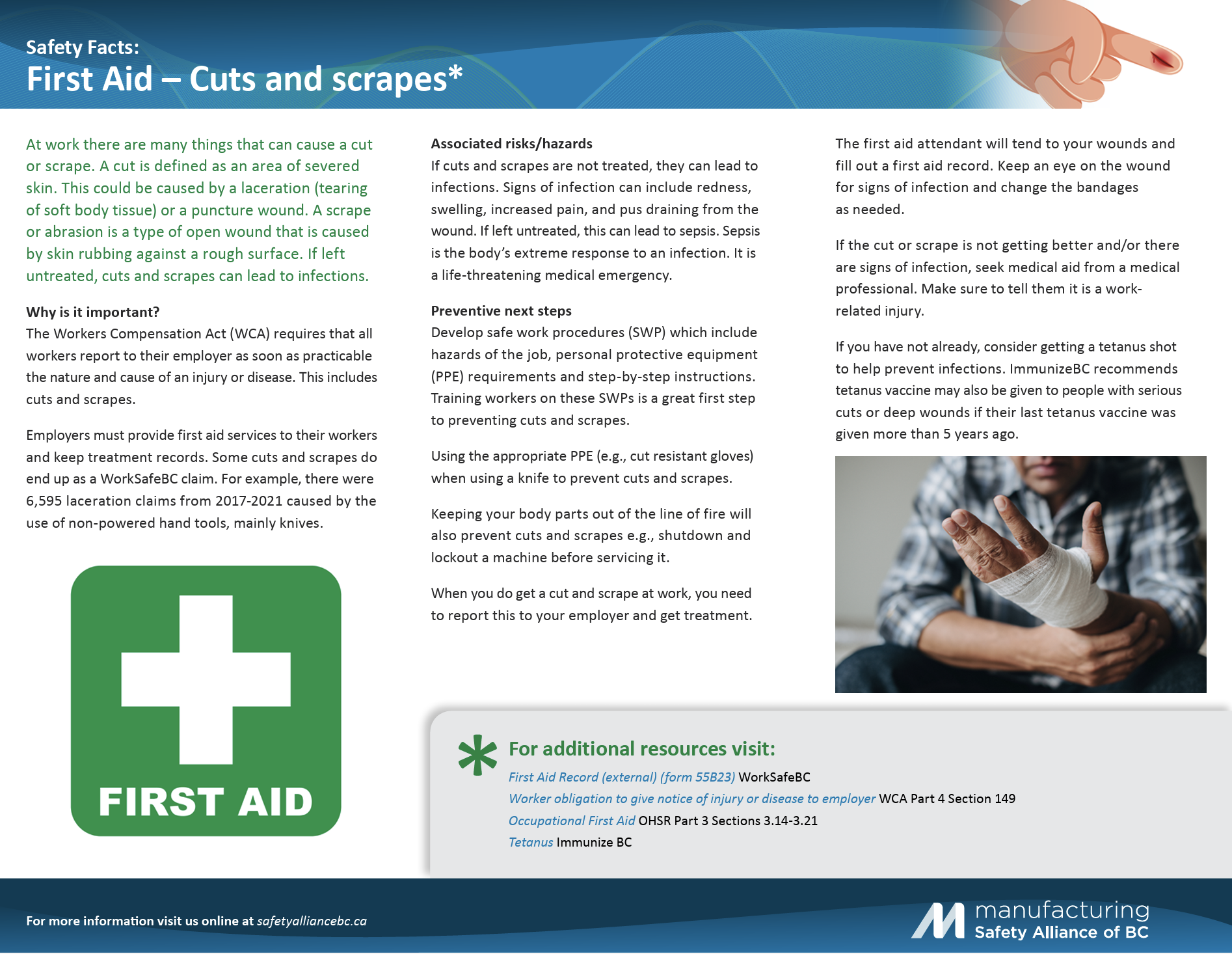 The Workers Compensation Act (WCA) requires that all workers report to their employer as soon as practicable the nature and cause of an injury or disease. This includes cuts and scrapes. Through this Toolbox Talk understand what hazards may appear if a cut or scrape is not treated properly; and best practices to protect your team members after a cut and scrape.
