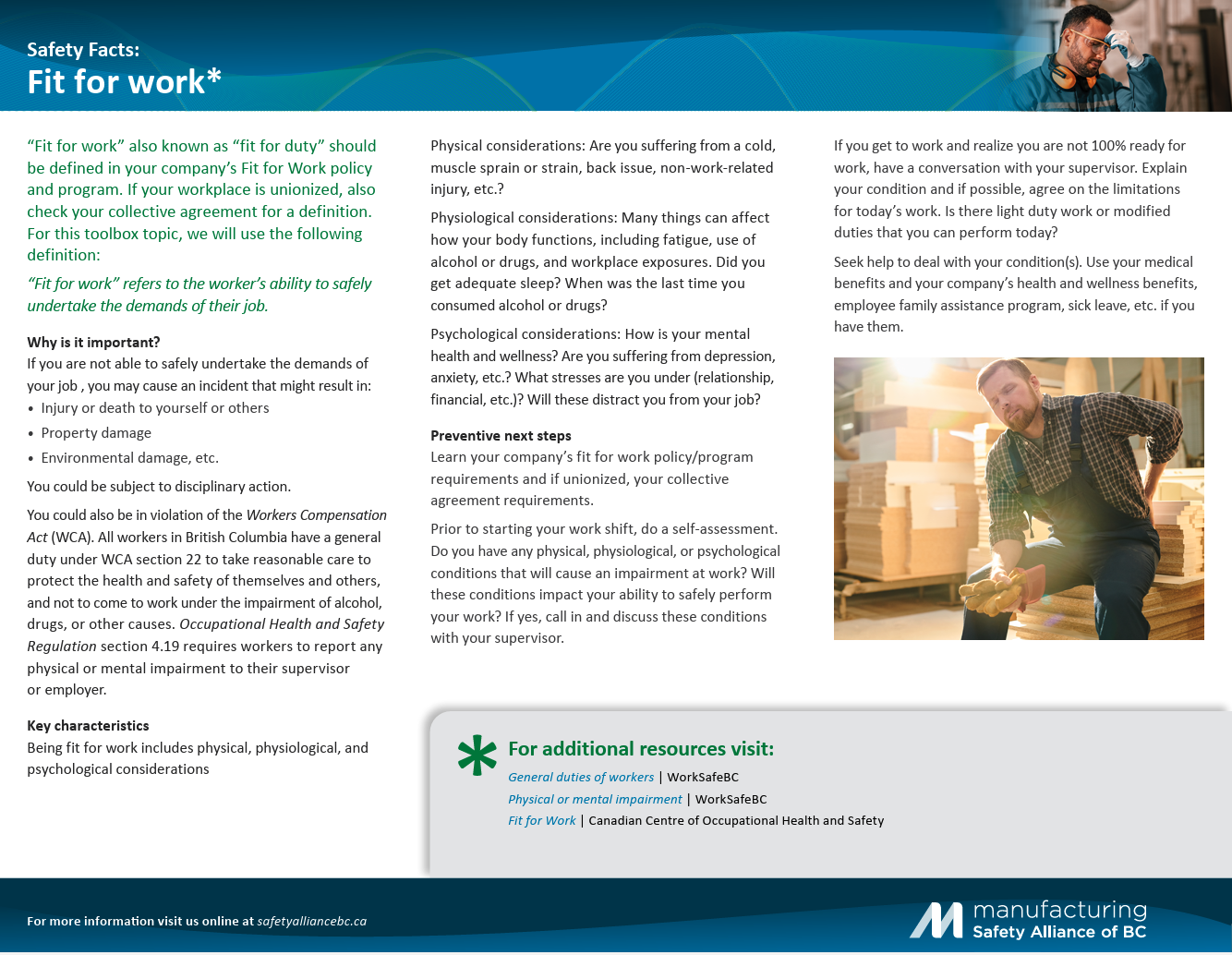 “Fit for work” also known as “fit for duty” should be defined in your company’s Fit for Work policy and program. If your workplace is unionized, also check your collective agreement for a definition. For this Toolbox Talk topic, “Fit for work” refers to a worker’s ability to safely undertake the demands of their job. If you are not able to safely undertake the demands of your job , you may cause an incident and may be subject to disciplinary action.