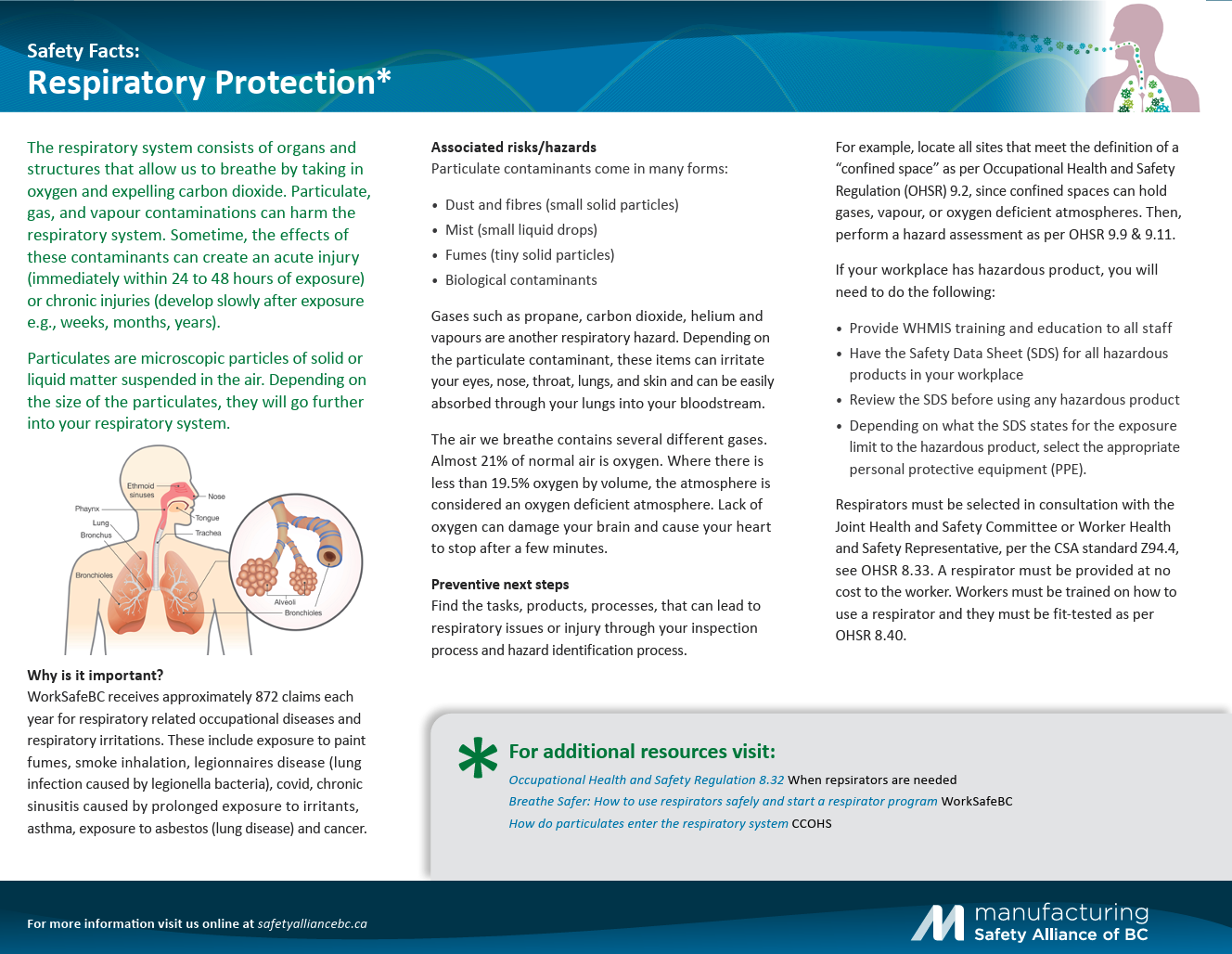 WorkSafeBC receives approximately 872 claims each year for respiratory related occupational diseases and respiratory irritations. In this Toolbox Talk, review what respiratory hazards may be present in your workplace and how workers and employers are working together to prevent respiratory incidents.