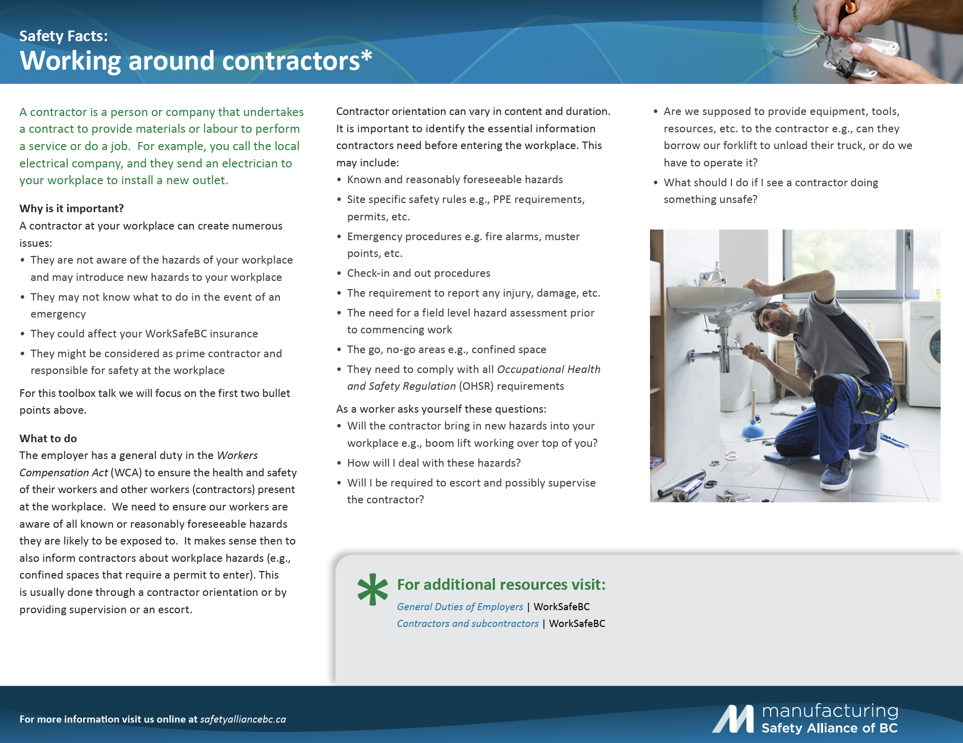 Hiring a contractor to work at your facility can create numerous issues. They may not aware of the hazards of your workplace and may introduce new hazards to your workplace. They may not know what to do in the event of an emergency. They could affect your WorkSafeBC insurance. Or they might be considered as prime contractor and responsible for safety at the workplace. Learn what types of hazards may present themselves when working with external contractors through this Toolbox Talk.